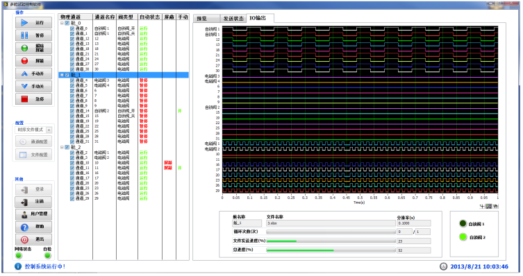 发动机点火时序控制系统是用来产生多达几百通道的逻辑时序波形;基于FPGA芯片搭建的、面向高速复杂时序输出的控制器,可实现独立多组多通道同步、高达100us分辨率时序信号输出。控制器提供灵活的通道配置和时序编辑方式,实现多舱时序独立的暂停、屏蔽、手动操作等功能。良好的人机界面提供方便快速的时序预览,高速可靠的FPGA处理保证各舱独立和舱内各通道时序同步,实时反馈时序发送状态和进度、灵活的配置信息存储和导入机制提高试验效率。